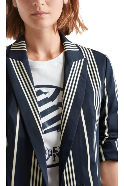 Erweitern Sie Ihre Garderobe mit diesem wunderschönen Blazer von Marc Cain. Gegründet im Jahr 1973, ist Marc Cain bekannt für seine hohen Standards in Design, Qualität, Materialien und Passform. Dieser Blazer verfügt über ein einzigartiges Streifendesign und ist teilweise mit Mesh gefüttert für zusätzlichen Komfort. Die Dreiviertelärmel haben einen lässigen Schlitz am Ende, was ihn perfekt für jeden Anlass macht. Aus Stretch-Baumwolle gefertigt, ist dieser Blazer sowohl stilvoll als auch bequem.