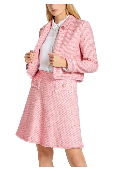 Marke: Marc Cain Kategorie: Jacken > Blazer Geschlecht: Weiblich Beschreibung: Kurze Bouclé-Jacke im Stil der Sechziger. Die Jacke ist aus einem bouclé-artigen Material gefertigt und erhält durch die coolen Fransen am Kragen, Verschlusskante, Ärmeln und Klappen einen zeitgenössischen Twist. Die angedeuteten Klappen sind mit einem zarten Gewebe unterlegt und es entsteht ein Layering-Effekt. An den Klappen finden sich zudem Schmuckknöpfe aus Glitzersteinen und Perlen, die mit dem Glitzergarn im Stoff korrespondieren. Farbe: soft pink. Körpernaher Schnitt. Hergestellt in Europa. Das Model ist 179 cm groß und trägt3/38. Das Modell fällt eine Größe kleiner aus. Stoffdetails: 40% Polyester, 36% Baumwolle, 11% Polyacryl, 9% Viskose, 4% Perlmutt.