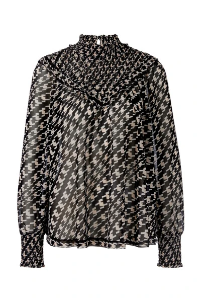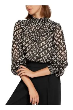 Vorstellen möchten wir die Marc Cain Bluse mit einem Sturm-Kragen – eine perfekte Ergänzung für Ihre Garderobe! Diese Bluse hat eine weitere A-Form mit Smokdetails, die eine erfolgreiche Mischung aus klassischen und verspielten Akzenten schafft. Der hohe Kragen und die Ärmel sind betont, und der Klebstoff kommt auch mit Smokdetails und endet in einer V-Form. Die breite Silhouette rundet das feminine Design ab. Aus 100% Polyester gefertigt, ist diese Bluse sowohl stilvoll als auch bequem.