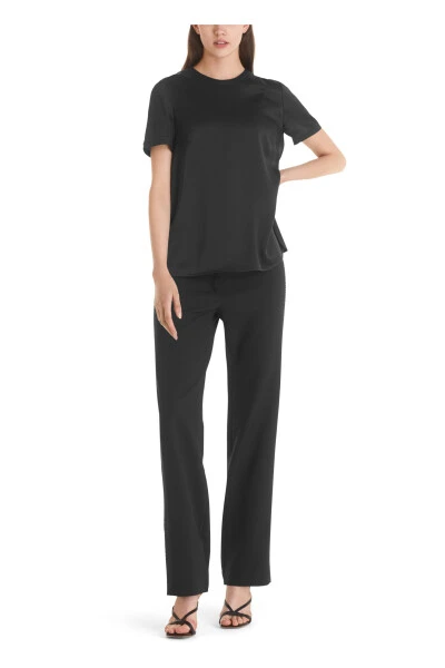 Veredeln Sie Ihre Garderobe mit dieser schwarzen Seidenbluse von Marc Cain. Der entspannte Schnitt und der runde Halsausschnitt schaffen eine kühlere Form, während die leicht bedeckten T-Shirt-Ärmel und die abgerundeten Saumkanten eine Note von Raffinesse hinzufügen. Kleine Schlitze an den Seiten mit einem Knopfverschluss runden das Aussehen ab.