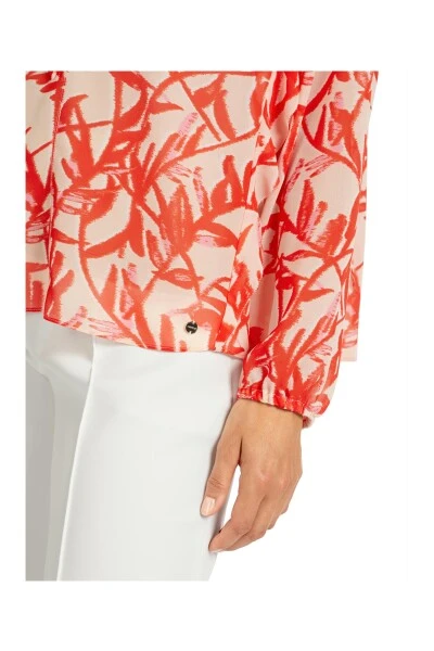 Sommerbluse mit Rüschen in einer breiten Silhouette aus glattem Material. Diese Bluse zeichnet sich nach dem spielerischen Design mit Rüschen und Schleifen aus. Das All-Over-Blumen-Design ist auch ein Augenfänger. Die Breite der Ärmel wird durch das Elastizitätsband betont.