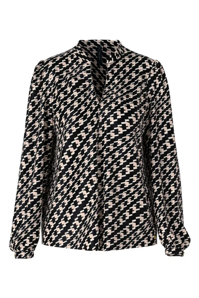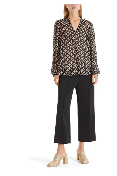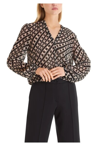 Erweitern Sie Ihre Garderobe mit dieser Marc Cain Bluse in einem geometrischen Design. Die weite Silhouette und der V-Ausschnitt mit einer Mittelnaht schaffen einen interessanten Look, während die schmalen Manschetten mit Metallknöpfen und der kleine Stehkragen zum Design der Bluse beitragen. Erhältlich in Schwarz, besteht diese Bluse aus 100% Polyester. Das Model ist 179 cm groß und trägt N3/38.