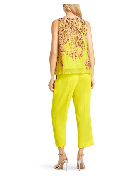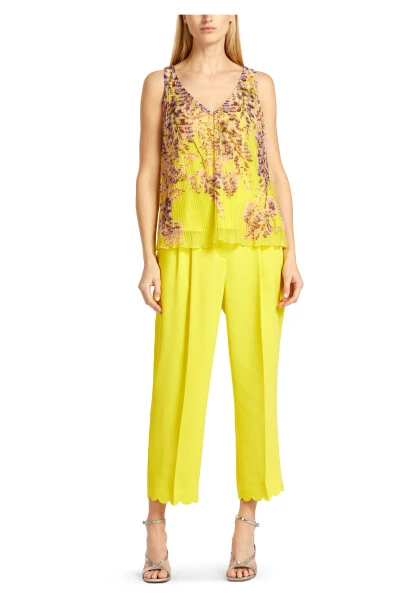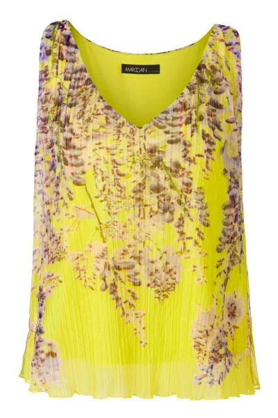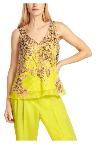 Fügen Sie Ihrer Garderobe mit diesem Marc Cain Plisse Top in A-Linie eine Note Eleganz hinzu. Das ärmellose Top hat einen tiefen V-Ausschnitt und besteht aus zartem Material mit Falten, die sich zum Saum hin öffnen. Die Platzierung des Glyzinienmotivs ergänzt die A-Linie-Silhouette. Die zitronengrüne Farbe verleiht Ihrem Outfit eine frische Note. Das Top ist mit Jersey-Stoff gefüttert für Opazität und Komfort. Das Model ist 179 cm groß und trägt N3/38.