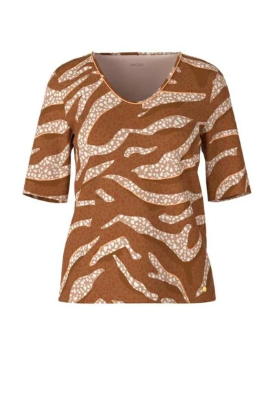 Vorstellung der Marc Cain ribbed shirt, perfekt für die modebewusste Frau. Diese lässige Bluse hat eine subtile A-Silhouette und halblange Ärmel aus Baumwolljersey mit Elasthan für Komfort. Das abstrakte Tiermuster auf der gesamten Bluse verleiht Ihrer Garderobe eine wilde Note, während der kontrastfarbene Paspel am runden V-Ausschnitt einen Farbtupfer hinzufügt.