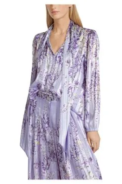 Marc Cain Schluppenbluse mit Mustermix | Diese Bluse kann mit oder ohne Schleife getragen werden. Die Ärmel sind gerafft und der Saum ist mit einem Gummizug zusammengefasst. Das Design kombiniert eine Transparenz/Opak-Webstreifen mit einem opulenten Glyzinien-Druck. Der Webstreifen ist mit einem Glitzerfaden akzentuiert. Das Modell ist gefüttert, was es blickdicht macht und einen perfekten Fall gibt. | Farbe: bright lilac | Lockerer Schnitt | Gerade Form | Das Model ist 179 cm groß und trägt N3/38. | Mustermix | Innenfutter: 100% Polyester.