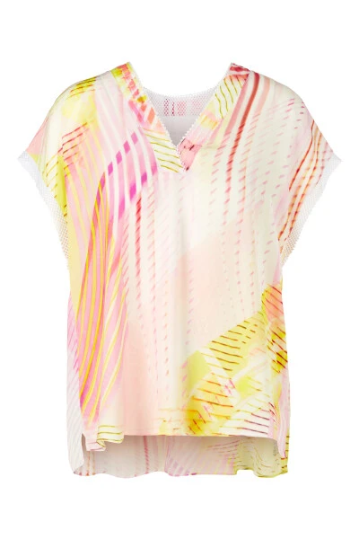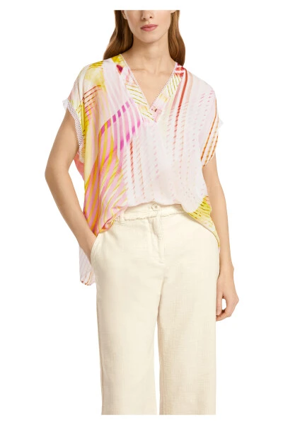 Marc Cain Gestreifte Bluse mit V-Ausschnitt – Diese entspannte Viskosebluse verfügt über Mesh-Details und ein asymmetrisches Design, das ihr eine einzigartige Note verleiht. Der tiefe V-Ausschnitt und das ärmellose Design machen sie perfekt für den Sommer, während der verlängerte Rücken mit Seitenschlitzen zur entspannten Silhouette beiträgt. Hergestellt in Europa aus 100% Viskose, kommt diese Bluse in einer hellen Limettenfarbe. Das Model ist 179 cm groß und trägt N3/38.