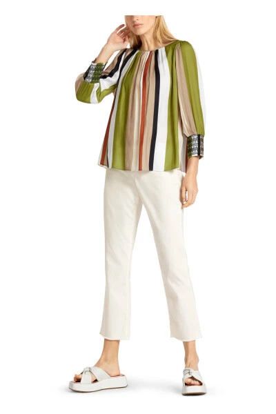 Verleihen Sie Ihrem Kleiderschrank mit dieser Marc Cain Collections Blusenshirt UC 55.18 W77 Bluse einen Hauch von Eleganz. Die A-Linien-Form und die gerafften Ärmel schaffen eine feminine Silhouette, während die tiefen olivgrünen Streifen eine Note von Raffinesse hinzufügen. Hergestellt aus 100% Polyester, ist diese Bluse sowohl bequem als auch langlebig.