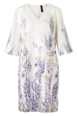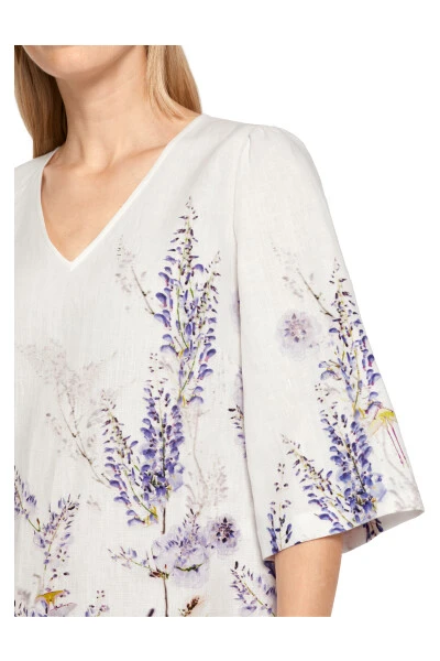 Leinenkleid in A-Linie|Das Kleid ist aus leichtem, kühlendem Leinen. Ausgestellt und mit weitem ¾-Ärmel, verleiht es eine elegante Silhouette. Die A-Linie wird durch den dicht mit Glyzinien bedruckten Saum betont. Das Leinenkleid hat einen V-Ausschnitt und ist per Reißverschluss im Rücken zu schließen.|Farbe: off-white|A-Linie|Angekräuselte Ärmel|Das Model ist 179 cm groß und trägt3/38.|Reißverschluss