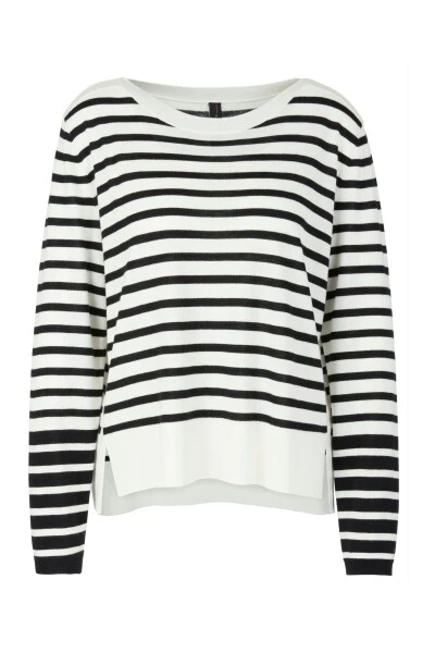Erweitern Sie Ihre Strickkollektion mit diesem hochwertigen Rundhalspullover von Marc Cain. Hergestellt aus einer Mischung aus Wolle und Kaschmir, verfügt dieses sportliche gestreifte Design über Galonstreifen in einer Kontrastfarbe für einen besonderen Effekt. Die entspannte, boxy Passform wird durch einen Bootsausschnitt und seitliche Schlitze betont.