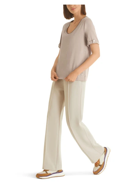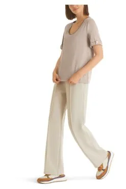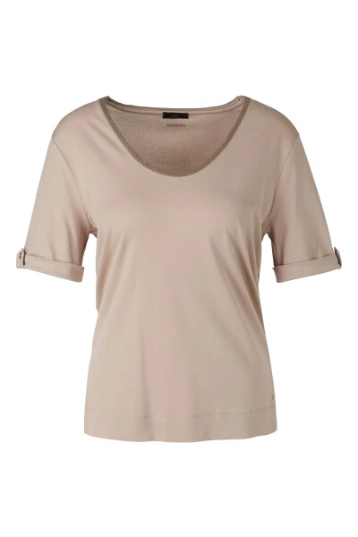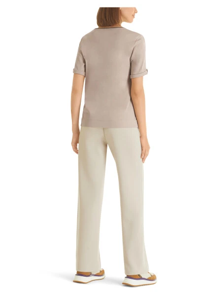 Suchen Sie nach einem bequemen und stilvollen T-Shirt? Suchen Sie nicht weiter als Marc Cains Baumwollshirt mit Lurex-Glanz. Dieses gerade und lässig geschnittene Shirt besteht aus bequemem Baumwolljersey mit einem Elastananteil, was es perfekt für den täglichen Gebrauch macht. Das Baumwollshirt wird am Ausschnitt mit einer gestrickten Lurex-Glanz-Manschette betont, während die halblangen Ärmel mit einem geknöpften Riegel feminin aufgerollt sind. Die glänzende Logo-Schrift über dem Saum setzt auch einen dekorativen Akzent. Erhältlich in Warm Stone, ist dieses Shirt in Europa hergestellt und kommt in einer geraden Form. Das Modell ist 179 cm groß und trägt N3/38. Mit einem V-Ausschnitt und Stoffdetails aus 95% Baumwolle und 5% Spandex ist dieses Shirt sowohl bequem als auch stilvoll.