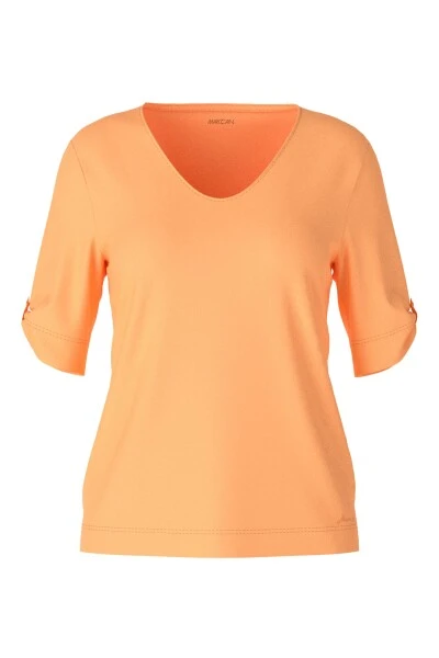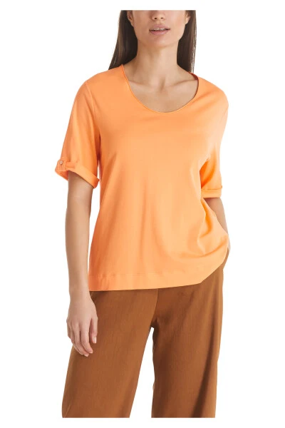 Suchen Sie nach einem bequemen und stilvollen T-Shirt? Suchen Sie nicht weiter als Marc Cains Jerseyshirt! Hergestellt aus einer hochwertigen Baumwollmischung mit einem Hauch von Elastan, hat dieses gerade geschnittene Shirt eine entspannte Silhouette und halblange Ärmel, die lässig umgeschlagen und mit einem Bar-Detail geknöpft werden können. Perfekt für jeden Anlass, ist dieses T-Shirt ein Muss für jede modebewusste Frau.