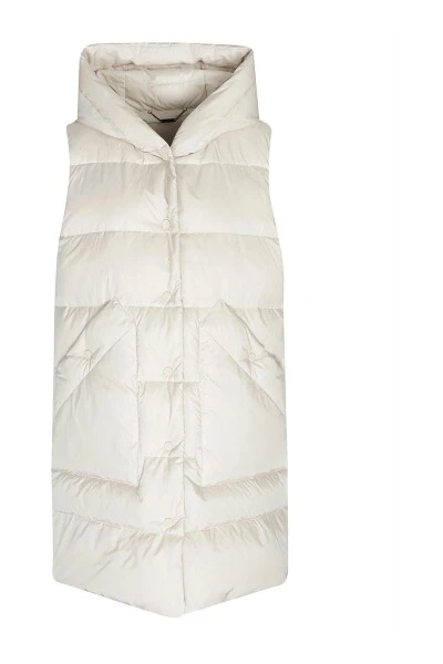Bleiben Sie warm und stilvoll mit dieser langen, gepolsterten Daunenweste von Marc Cain für Frauen. Ausgestattet mit einer Kapuze und Taschen mit Druckknöpfen, ist diese Weste perfekt für kalte Tage. Die Daunen in dieser Weste stammen von Lieferanten, die für ihr Tierwohl zertifiziert sind. Das Modell wird mit Logo-Druckknöpfen geschlossen.